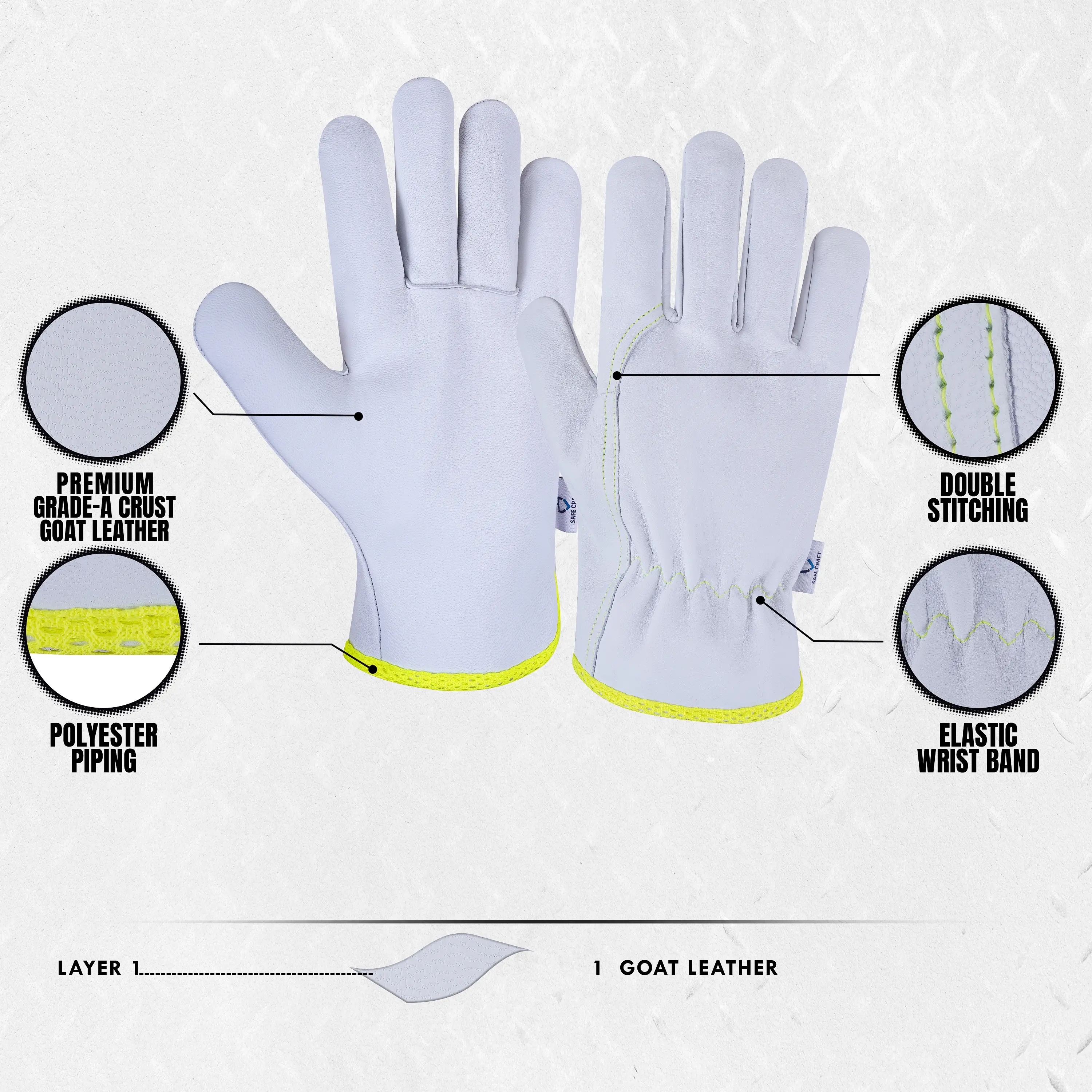 Designed for performance and comfort, these premium driver gloves offer superior dexterity and durability for all-day wear. Made from Grade-A crust goat leather, they provide a soft, flexible feel with excellent grip and control. The wing thumb design enhances movement and reduces hand fatigue, while the fluorescent yellow polyester piping adds a touch of visibility and style.