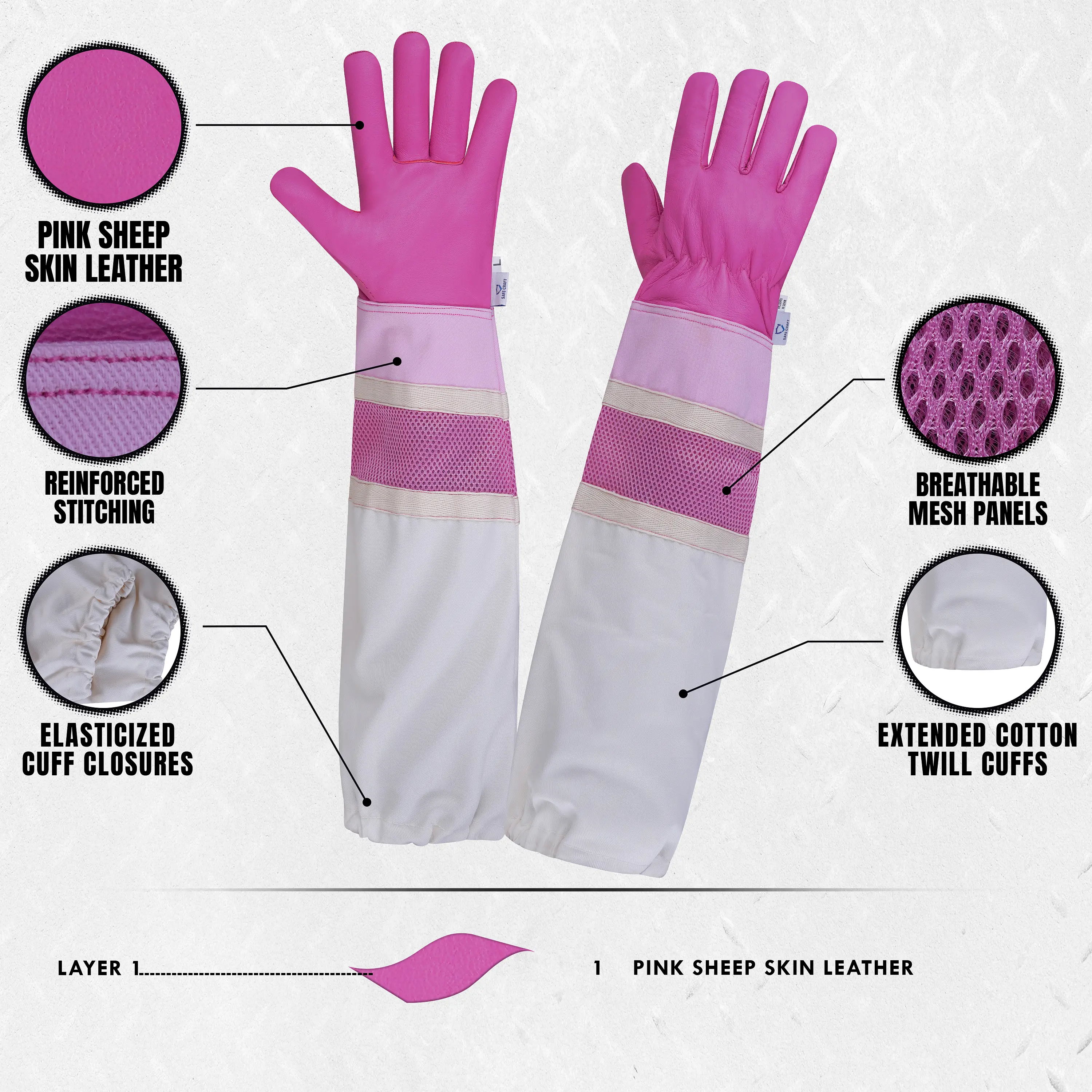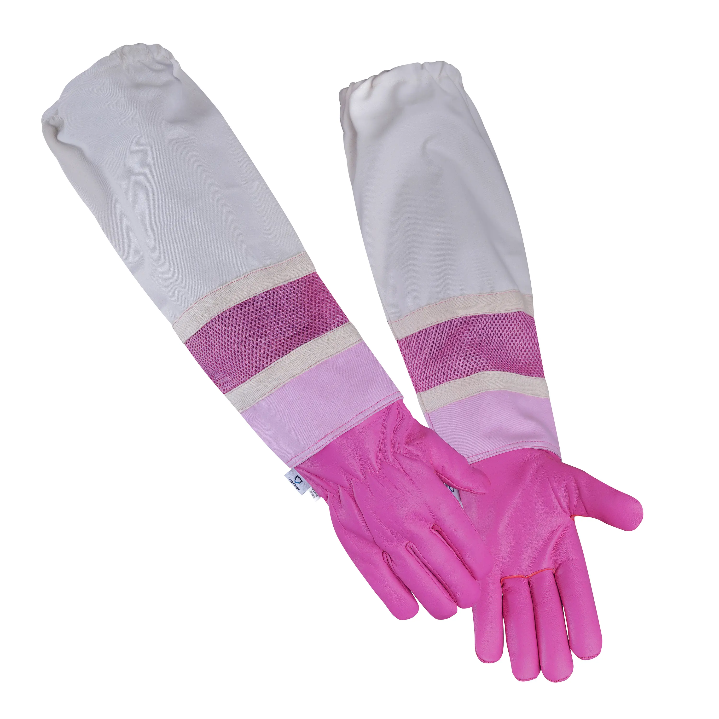Specially designed for women beekeepers, these elegant Pink Sheep Skin Leather Gloves combine style, comfort, and protection. The soft, supple leather offers exceptional flexibility and a gentle feel, while breathable mesh panels keep your hands cool during hive inspections. The extended cotton twill cuffs provide full coverage against bee stings, and elasticized closures ensure a secure, comfortable fit. With a straight thumb design for easy movement, these gloves deliver both performance and feminine appeal for confident beekeeping.