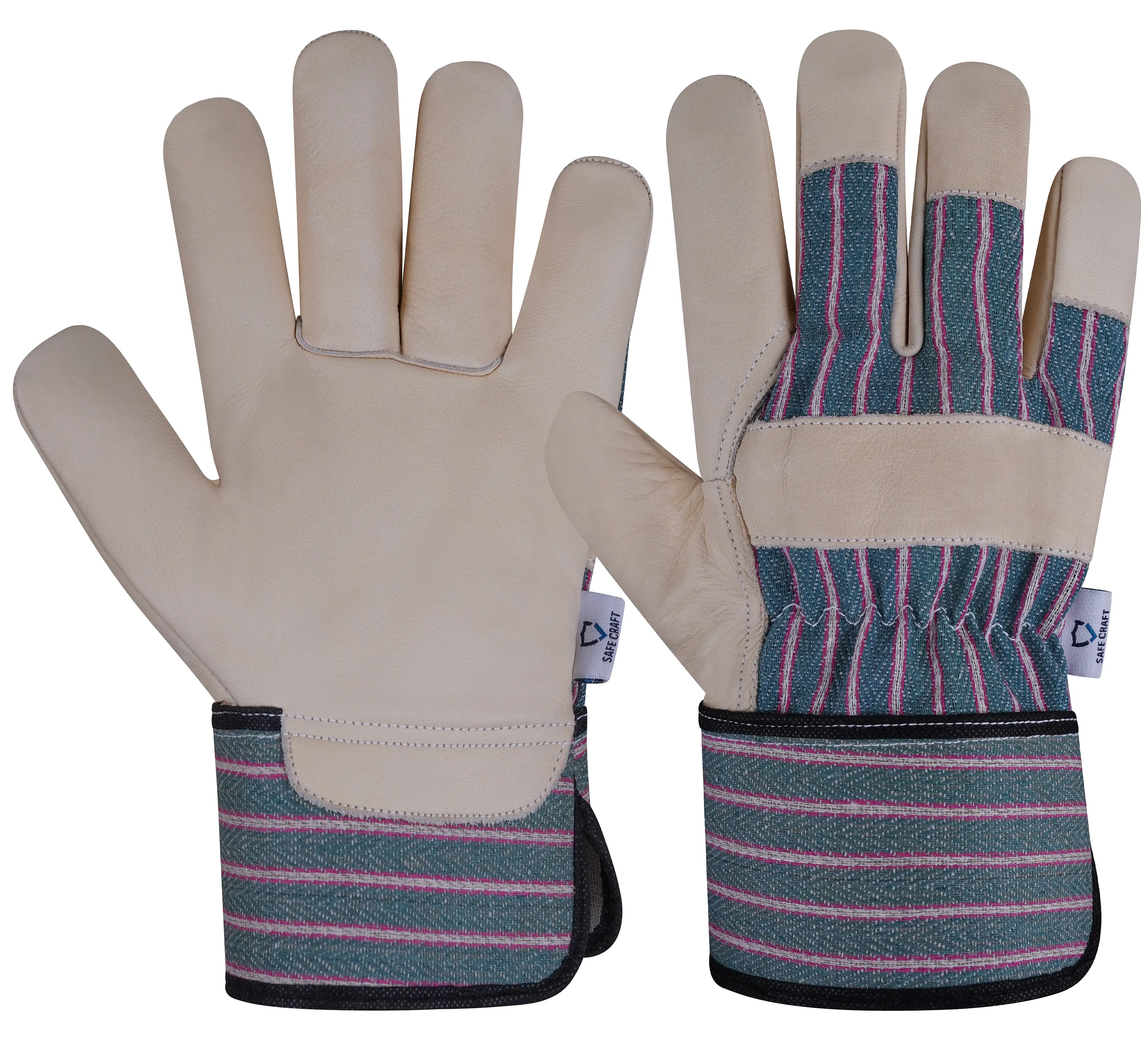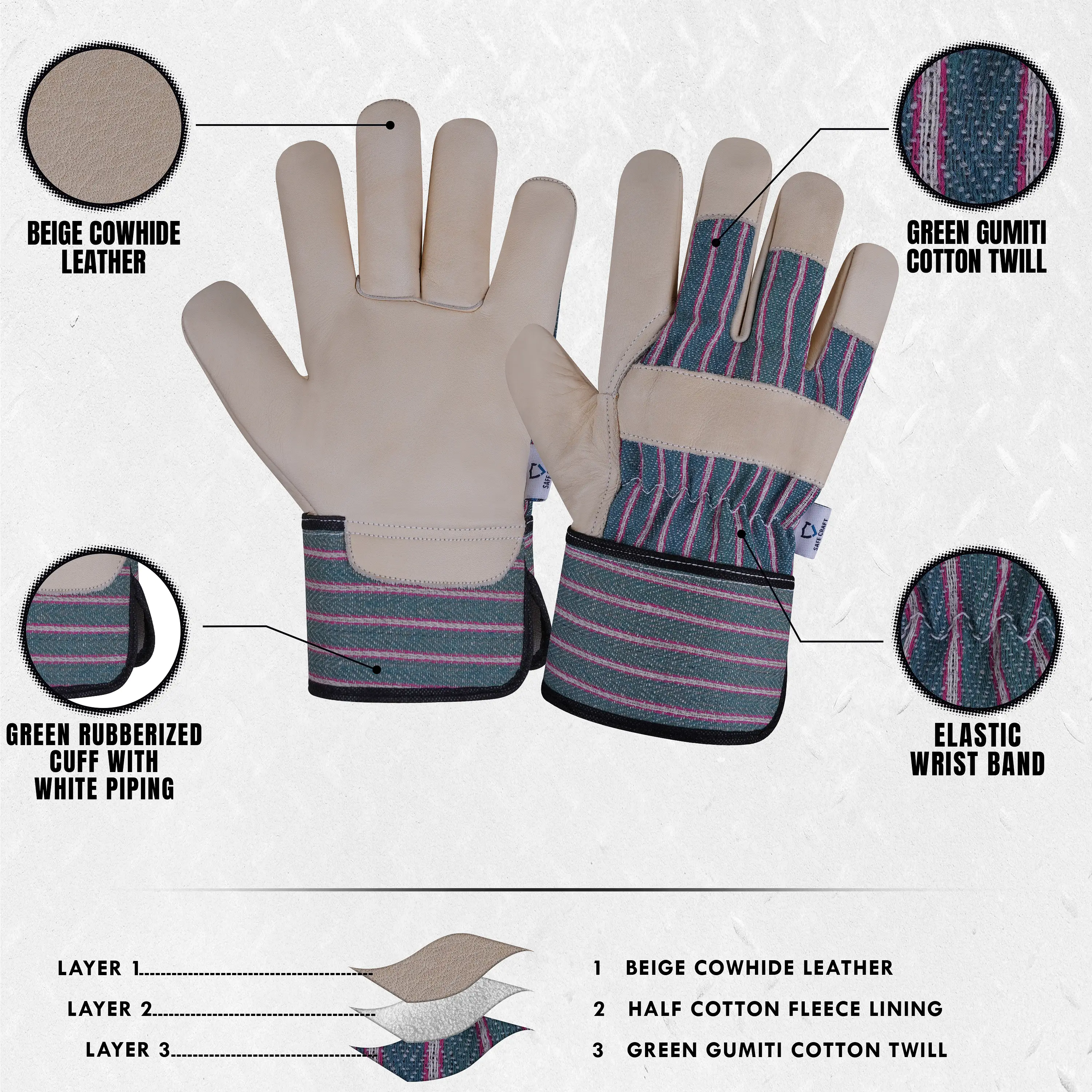 Engineered for comfort, protection, and durability, these rigger gloves feature a Beige Cowhide Leather palm and fingers for strong abrasion resistance and reliable grip. The half cotton fleece lining provides warmth and comfort, while the green Gumiti cotton fabric back ensures flexibility and breathability. The rubberized cuff with black piping offers a secure fit and enhanced durability. Perfect for mechanical, industrial, and general handling tasks, these gloves deliver dependable performance and all-day comfort.