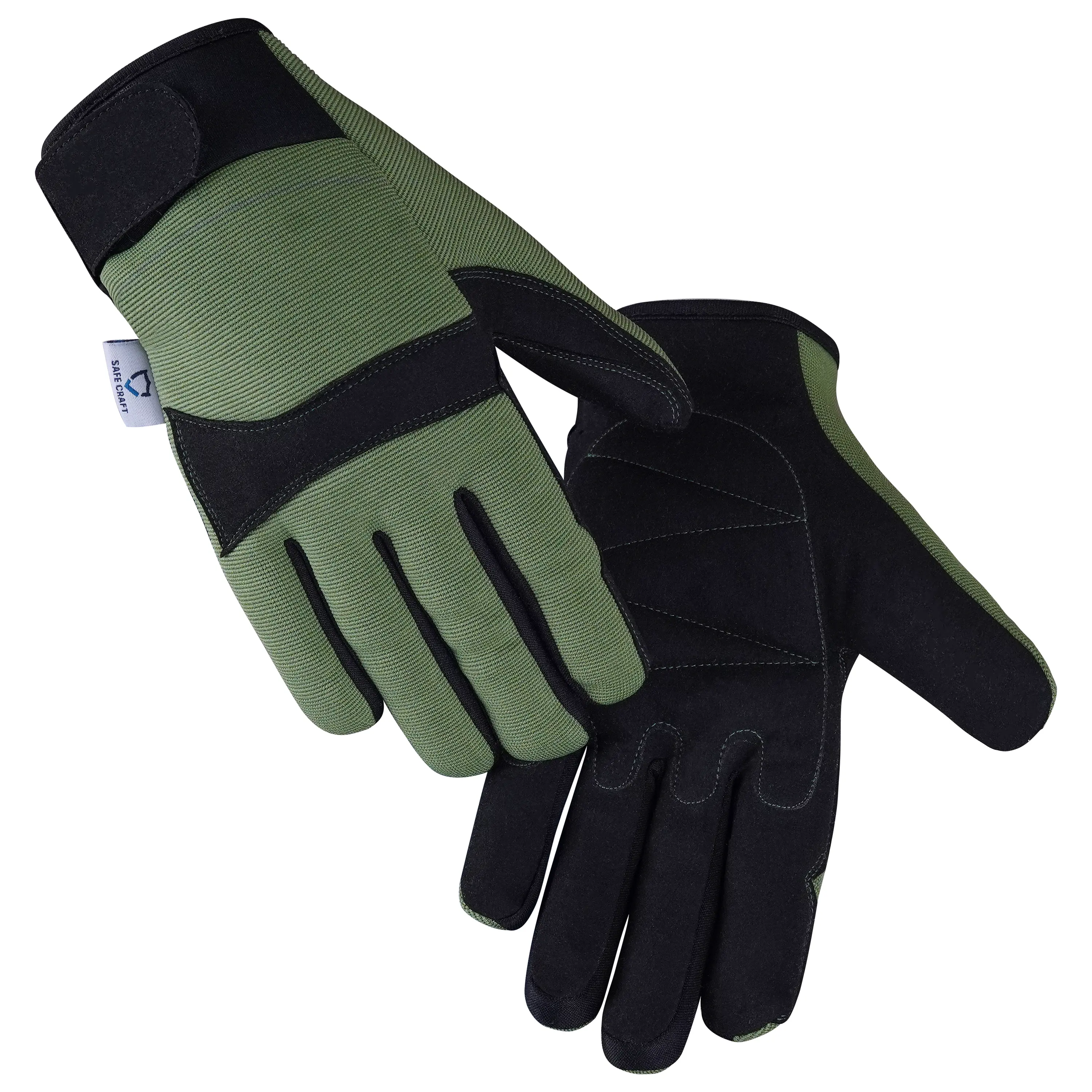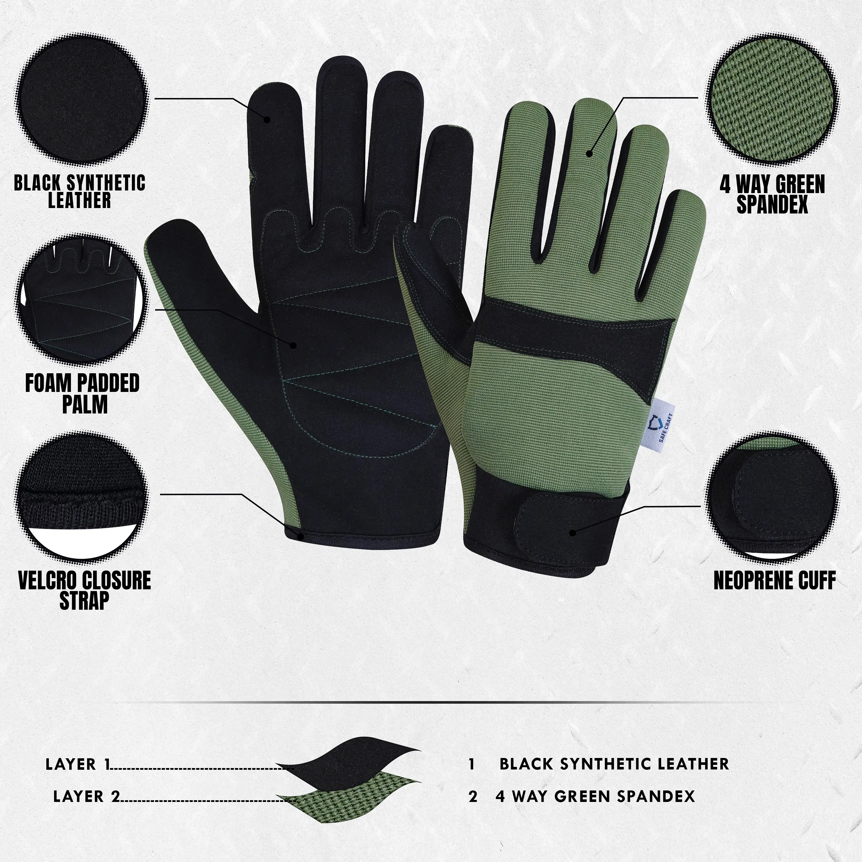 Built for comfort, protection, and dexterity, these gloves feature a Black Synthetic Leather palm with foam padding to provide enhanced grip, cushioning, and impact absorption. The Green Spandex back offers flexibility and breathability, while the Neoprene cuff with Velcro closure ensures a secure and adjustable fit. Ideal for mechanical, assembly, and industrial tasks, these gloves deliver reliable performance, comfort, and control in demanding work environments.
