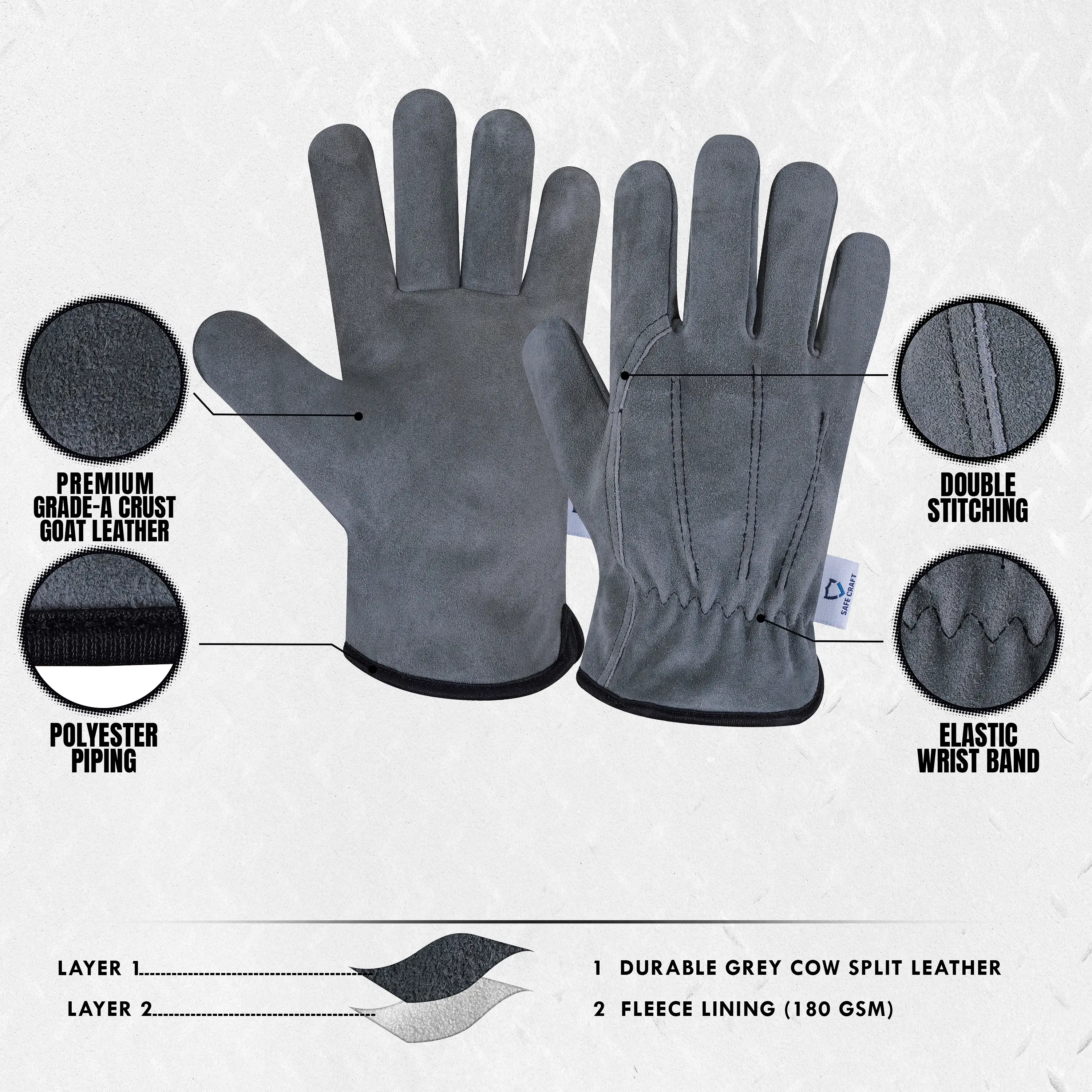Built for tough performance and lasting comfort, these driver gloves are ideal for demanding work environments. Made from durable grey cow split leather, they provide strong protection, reliable grip, and exceptional wear resistance. The black polyester fleece lining ensures warmth and comfort, while the wing thumb design enhances flexibility. Finished with black polyester piping for a professional and sturdy look.