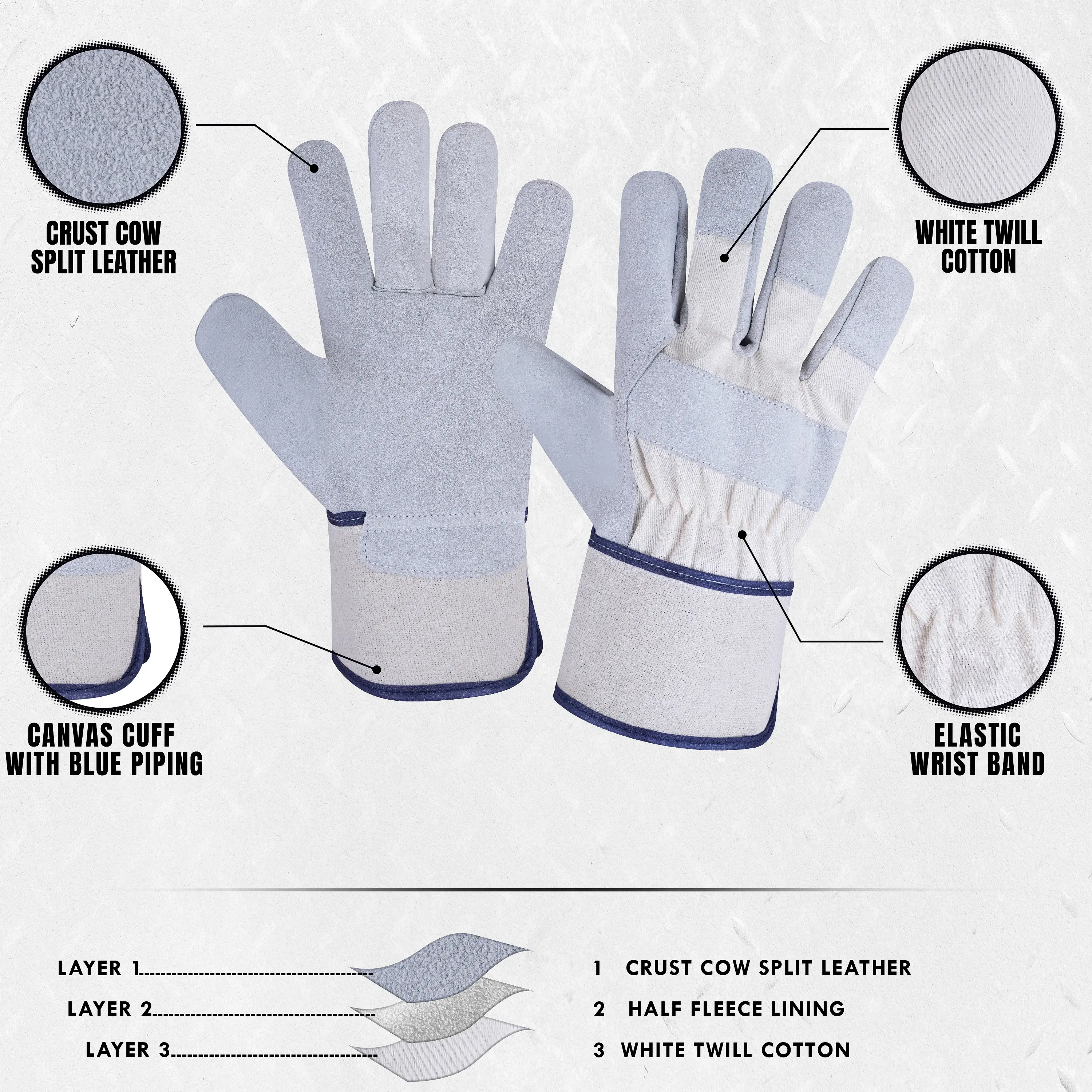 Crafted for durability, comfort, and reliable performance, these rigger gloves feature a Crust Cow Split Leather palm and back for strong abrasion resistance and flexibility. The half fleece lining provides warmth and comfort during extended wear, while the canvas cuff with blue piping ensures a secure fit and added durability. Perfect for mechanical, fabrication, and industrial tasks, these gloves offer dependable protection and all-day comfort in demanding work environments.
