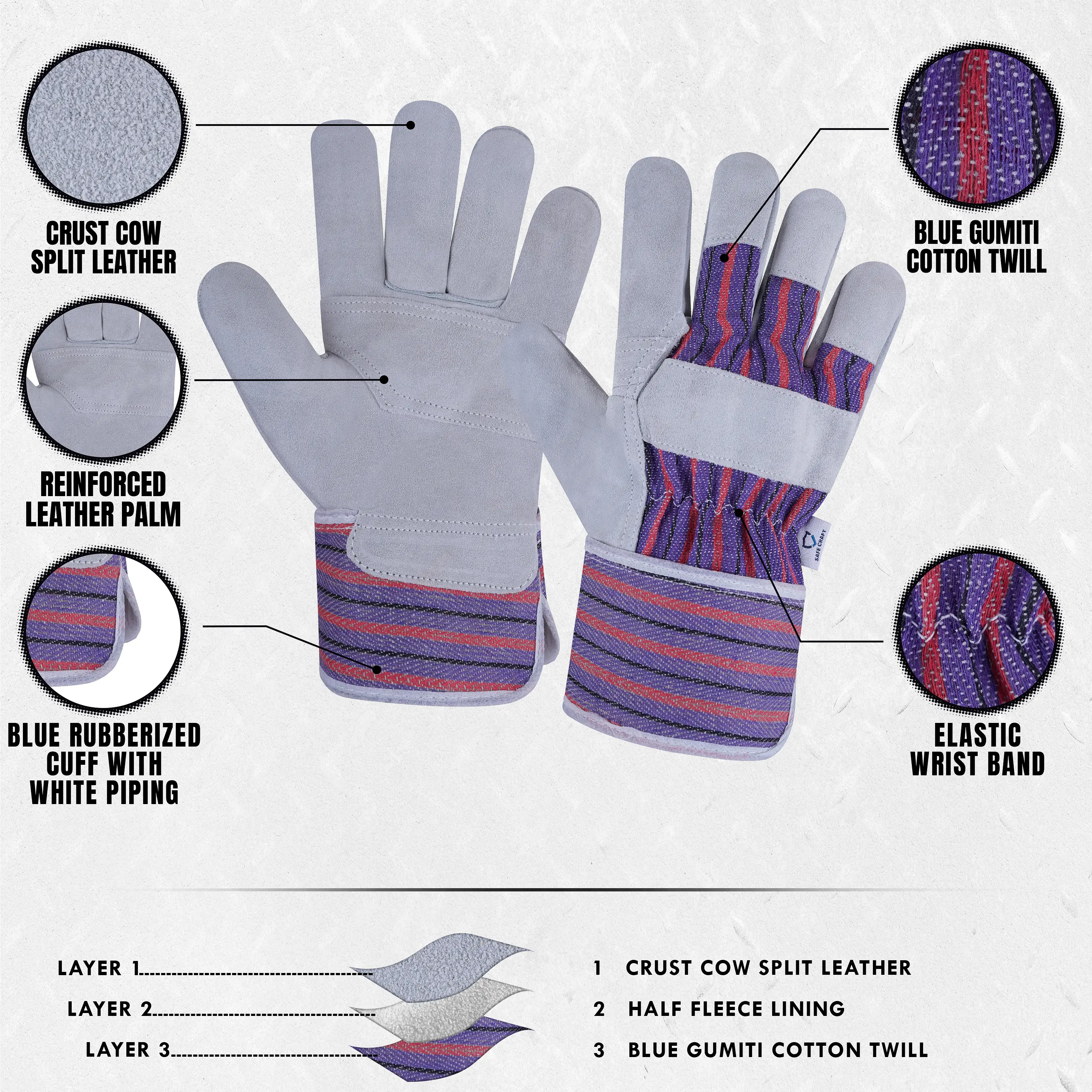 Crafted for comfort, protection, and durability, these rigger gloves feature a Cow Split Leather palm and fingers for reliable grip and abrasion resistance. The half cotton fleece lining provides warmth and comfort, while the blue Gumiti cotton twill back offers flexibility and breathability. The rubberized cuff with white piping ensures a secure fit and added durability. Perfect for mechanical, industrial, and general handling tasks, these gloves deliver dependable performance for extended use.